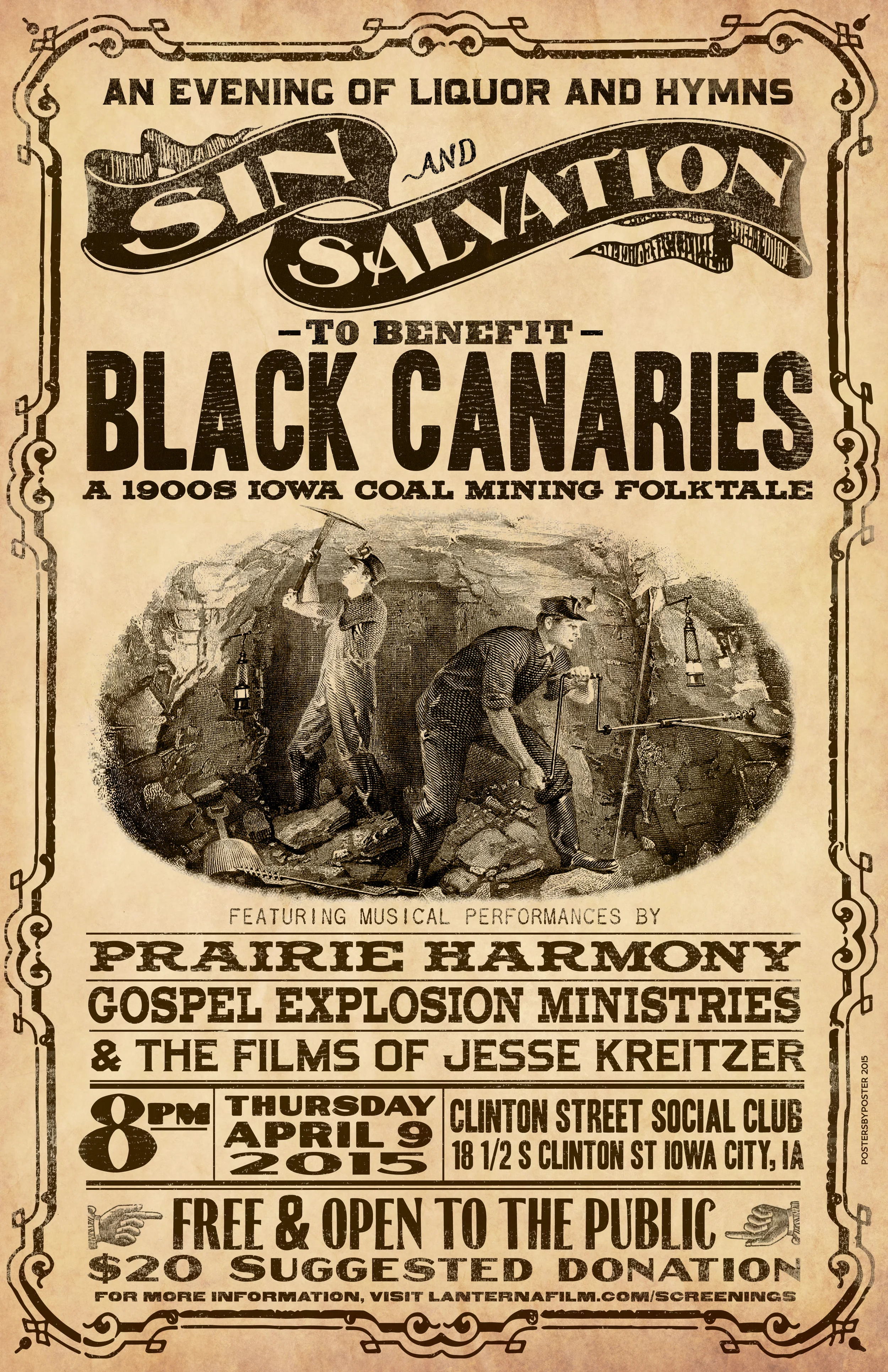 The event is a benefit for Kreitzer’s MFA thesis film Black Canaries, an ambitious 1900s coal mining folktale inspired by his Iowan heritage. The evening will feature gospel and sacred harp musical performances from Fairfield’s Prairie Harmony and Iowa City’s Gospel Explosion Ministries and the Iowa-produced films of Jesse Kreitzer, including an exclusive first look at Black Canaries.